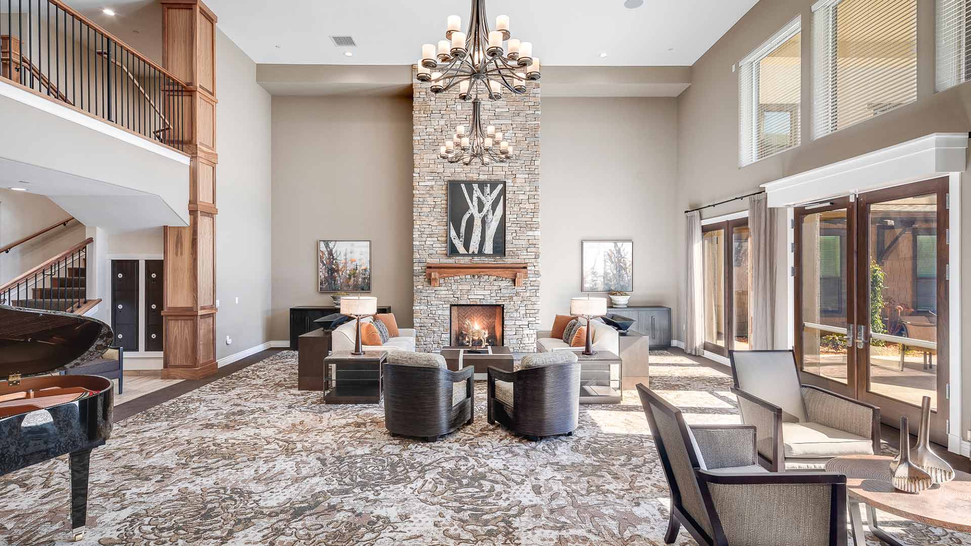 Bright, spacious lobby with wood beams, chandelier, and a round table with flowers in the center. Reception desks and office furniture are along the walls; a balcony overlooks the area above.