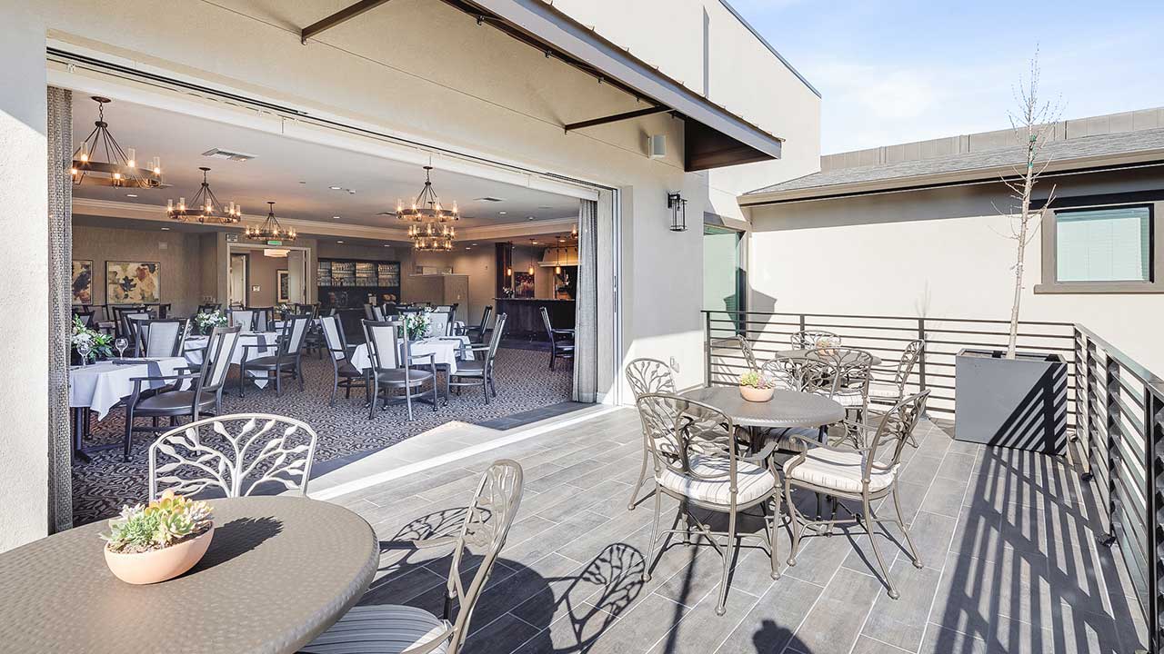 A modern dining area with large glass doors opens onto an outdoor patio with metal tables and chairs, potted succulents, and a railing, allowing natural light to fill both spaces.